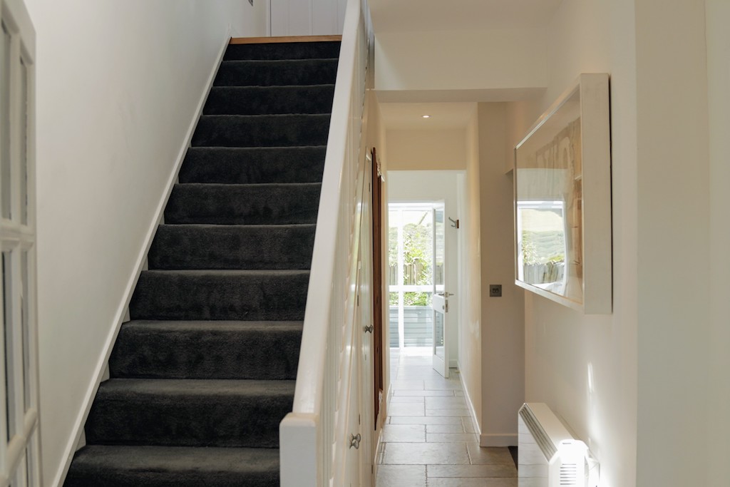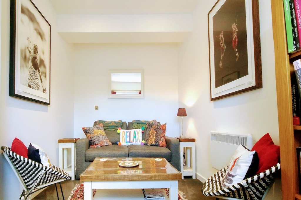 Entering into the main hall, the stair ascends to the living space and a long airy hallway to the left. The cosy nook to the right of the entrance hall invites you to unwind on its inviting sofa bed (suitable for 1 extra guest), surrounded by cultural art, an eclectic bookcase filled with intriguing books and entertaining games. A Smart TV with Freeview offers endless entertainment options on those slower, more relaxed days.