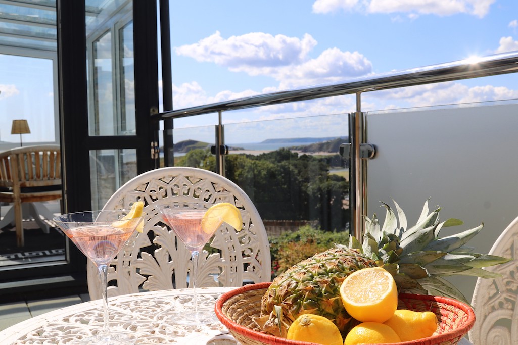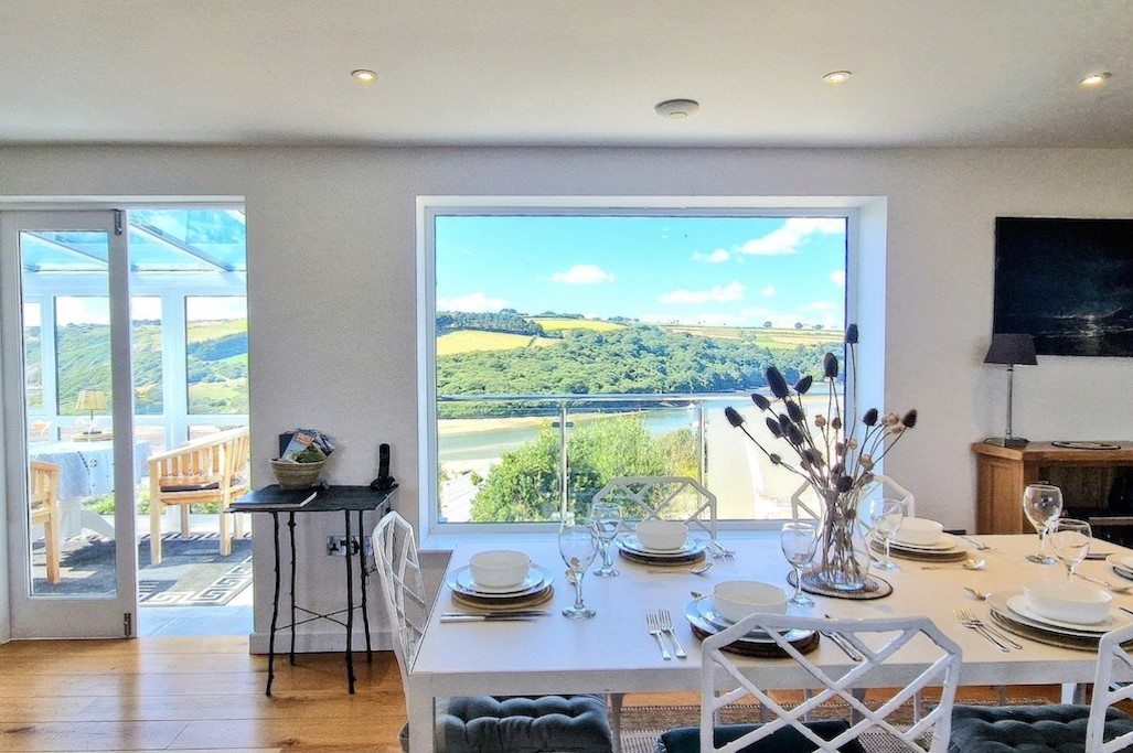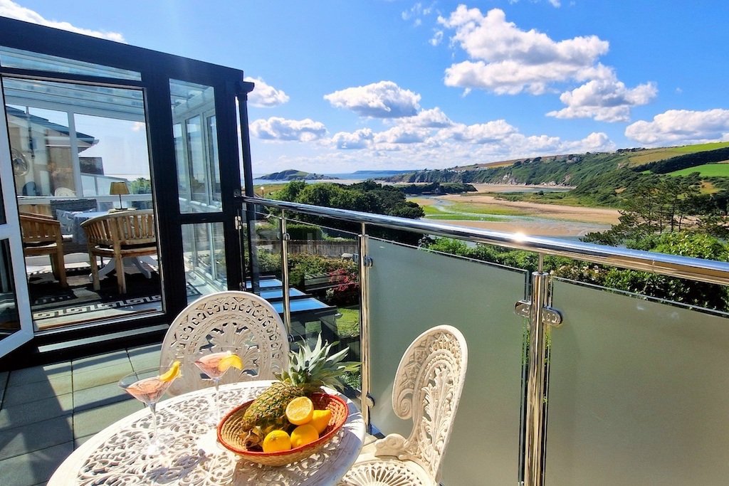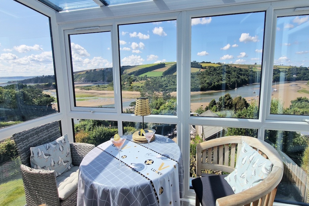 A magnificent glazed sunroom, poised above the garden, offers breathtaking views of Burgh Island and the estuary. A single step leads onto a beautiful balcony, a serene spot to savour the tranquil water views on the vintage-style bistro set.