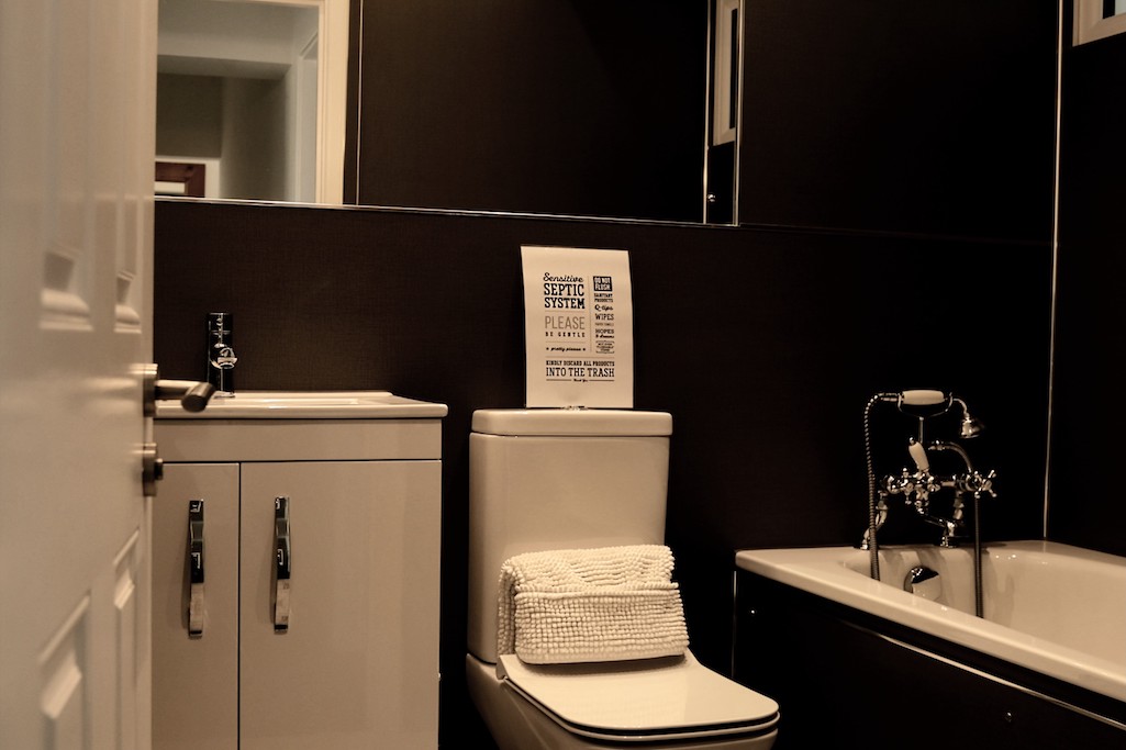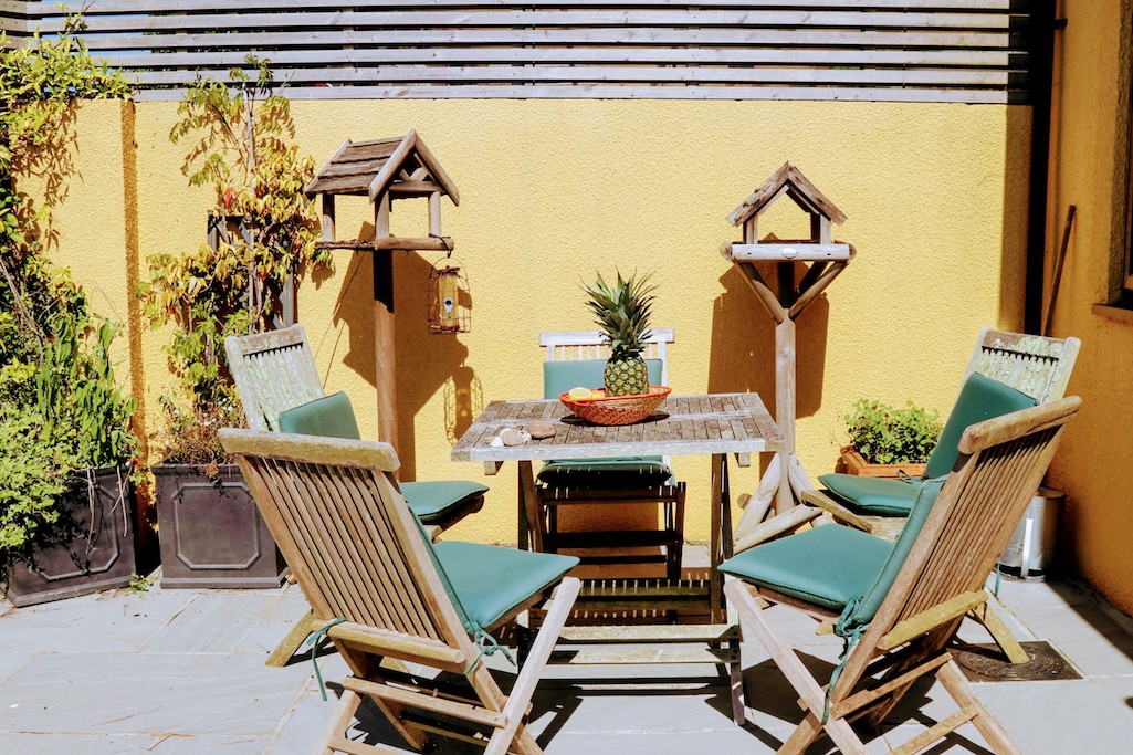 At the rear of the ground floor, the utility area, complete with a charming butler sink, iron and access to a fully enclosed courtyard is located. On arrival, this will be the initial entrance for guests. The rear entrance leads out onto the patio garden where you can enjoy the exhilarating experience of a hot outdoor shower under the open sky or bird watch while enjoying your favourite tipple sat at the patio table.