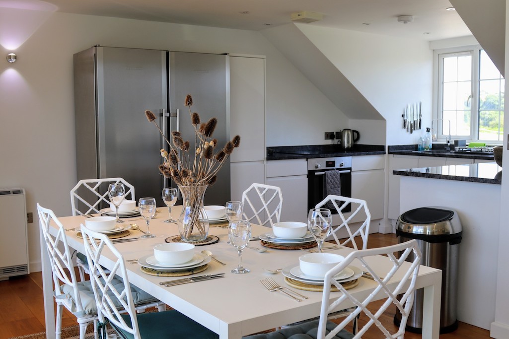 The well-appointed kitchen is a culinary delight, offering a large American-style fridge freezer, electric induction hob and oven, dishwasher, and a breakfast bar. The dining table seats six, providing a picturesque backdrop of the estuary’s stunning vistas, perfect for sharing meals and creating memories.