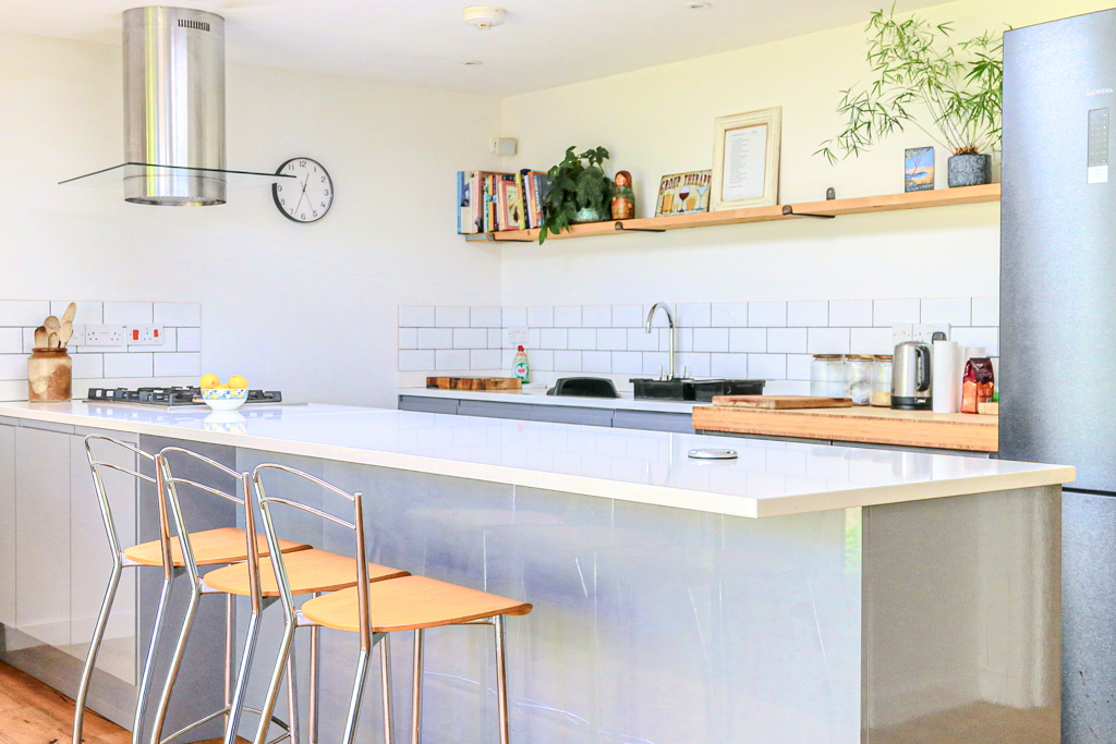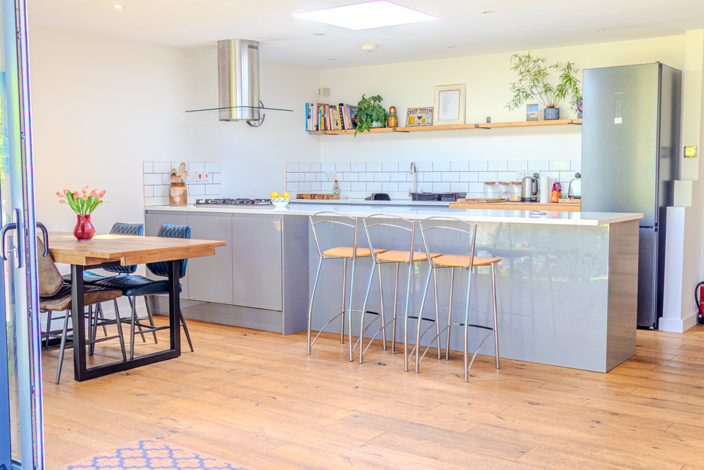 The living area is centred around a generous L-shaped sofa, paired with a smart TV and immersive surround sound system—perfect for cosy nights in. Opposite, the kitchen makes a statement of its own. Thoughtfully designed with a modern farmhouse aesthetic, it features exposed wooden beam shelving, a striking floating extractor fan, and a fully equipped setup including gas hob, electric oven, dishwasher, fridge freezer, microwave, kettle, toaster, and complete crockery and cutlery—everything you need for relaxed, self-catered stays.