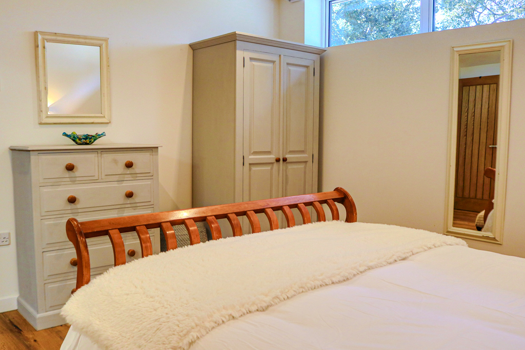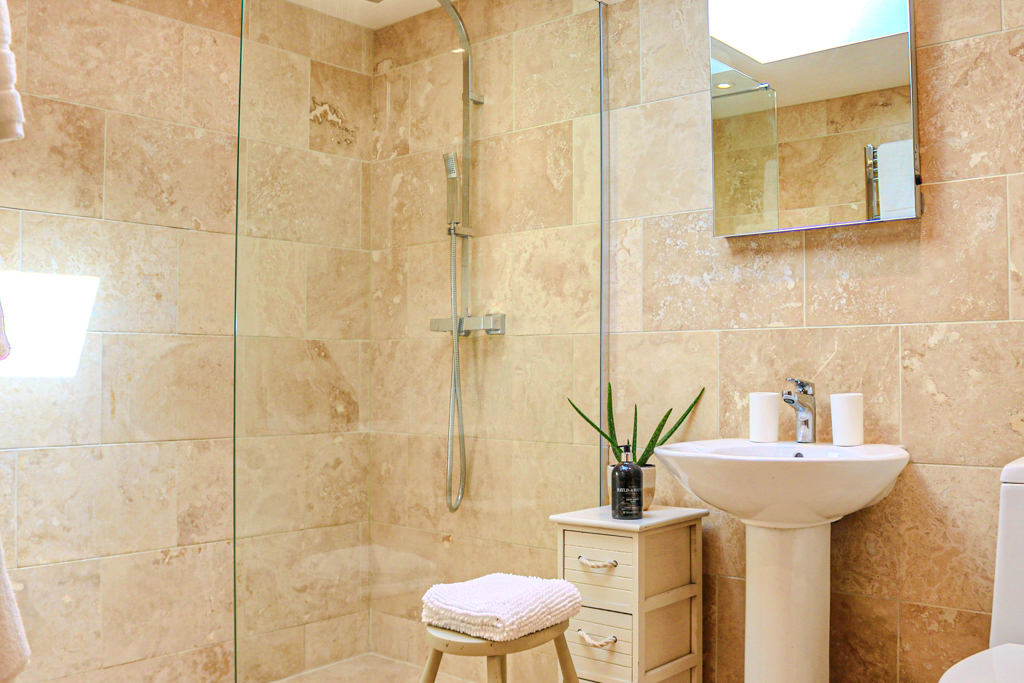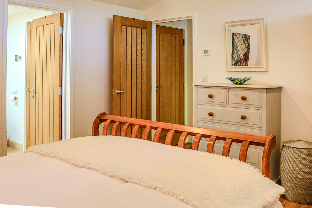 Up a short flight of stairs and tucked away for ultimate rest and relaxation, the bedroom offers a unique rustic chic retreat designed for deep, uninterrupted sleep. Featuring a sumptuous king-size bed, this cocoon-like space is both intimate and indulgent, with a high-level strip window that allows soft natural light to filter in while maintaining complete privacy. The adjoining large en-suite bathroom is finished to a high standard, complete with a spacious walk-in shower featuring a rainfall head, basin, WC, heated towel rail, and thoughtful touches including a shower stool for added comfort.