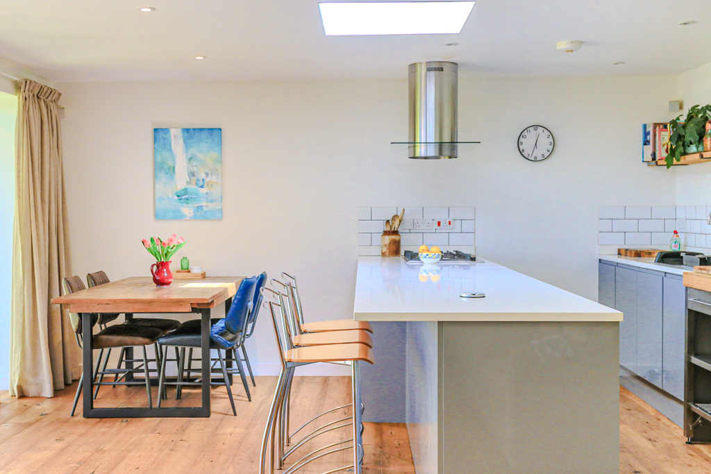 Natural light pours in from a Velux window above the kitchen, enhancing the bright, airy feel throughout and adding to the property’s calm, romantic ambience.